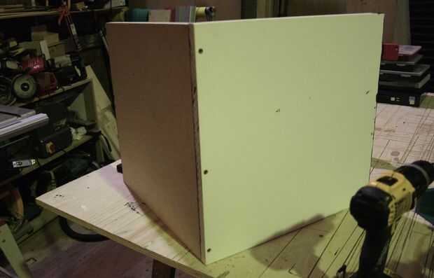 Ahora contador fregadero, pegamento y tornillo de los tableros de 438 x 438 mm (superior e inferior) que están orientados correctamente. Las fronteras de 36mm deben ayudar con esto.