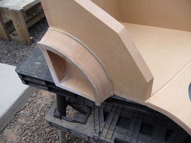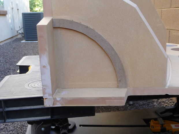 Comenzar midiendo desde el centro hasta el borde exterior de la boquilla. Utilizando un trozo de 1/4" de madera, un cuarto anillo cortado tiene esta radio exterior la es ¾" de ancho. Clavos y pegamento en su lugar. El siguiente anillo es dos espesores de MDF pegadas. Su radio exterior es 1/8 menos que la primera pieza y es una 1/2" ancho y corte en el mismo ángulo que los bordes de los lados. Pegamento y la abrazadera en su lugar. Ahora sería un buen momento para arena, archivo o escofina el material adicional sobre las piezas del exterior. Cortar la última pieza de la tabla de 1/4". En radio debe ser un 1/8" mayor que la pieza detrás de él y ¾" de ancho. Pegamento y la abrazadera en su lugar. Ahora tiene una boquilla de aspecto decente.