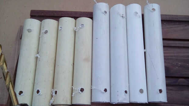 Los tubos se fijan a la pared posterior con tornillos. Los tubos fueron perforados a través de todo el camino con una broca de 4 mm y luego se perforaron los agujeros frontales para permitir espacio para el sostenedor del pedacito en el taladro de (12 mm en mi caso).