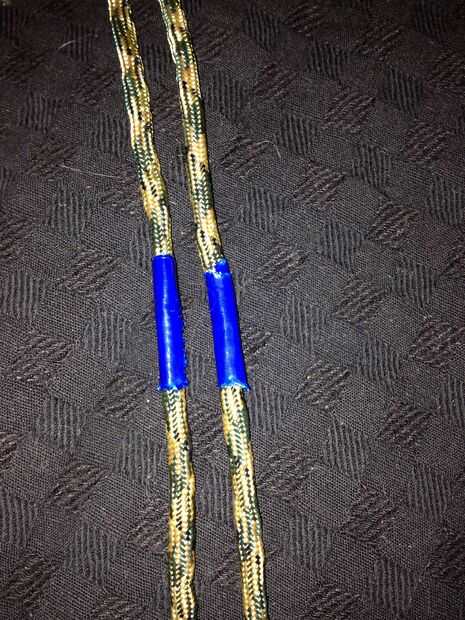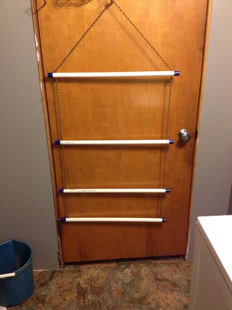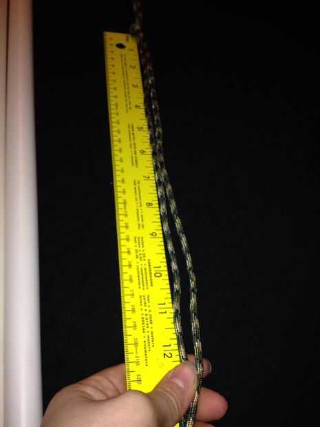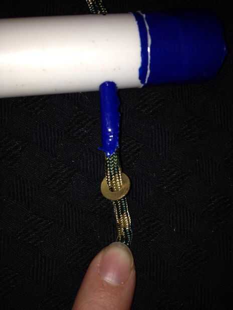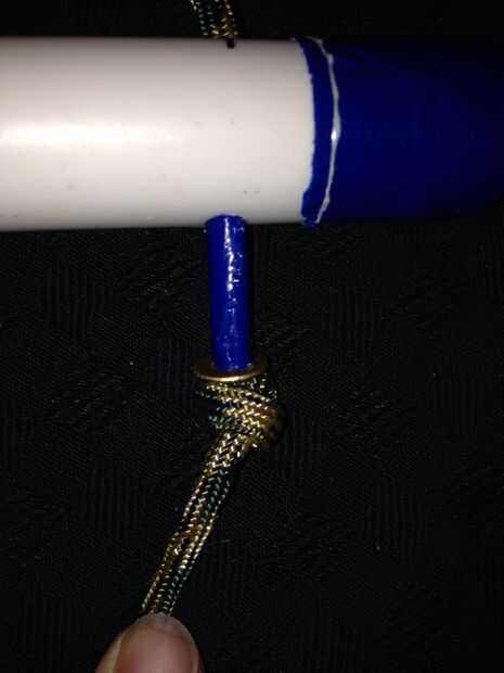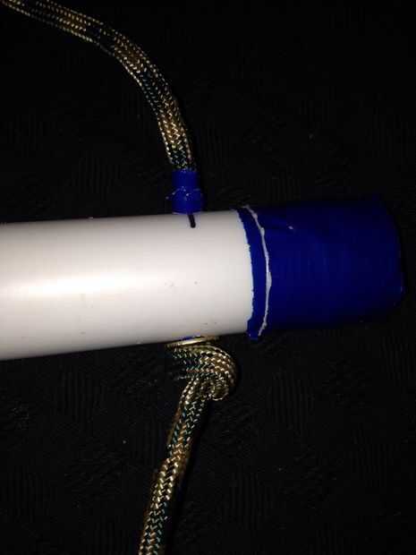 Luego pase los cordones por los agujeros en la bandeja primero seguido por una arandela. Una vez en empuje del PVC y la arandela hacia arriba pasado el marcador de cinta de conducto y luego un nudo justo por debajo de la cinta. Empuje el PVC y la lavadora hacia abajo para que se sientan en el nudo y el conducto cinta visible a ambos lados de la tubería (esto ofrecerá cierta protección contra desgaste para los cordones. Hacer este paso tres veces más y listo!! Tiene un rack de manta!