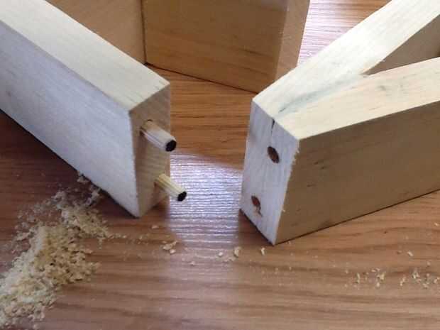Para unir la parte inferior de la R a la parte superior de la A, la fuerza era una preocupación importante. Usé 1/4" espiga, simplemente taladrar dos agujeros rectos de 1/4" en la parte inferior de la T. Si tienes puntos de espiga, a introducir en los agujeros y alinee la A con la T. Los puntos marcan donde perforar. En caso contrario, cortar dos piezas iguales de pasador, marcar los extremos con pintura y alinearlos. Taladros rectos en los puntos de pintura. Utilizar el pegamento generosamente en las superficies de acoplamiento y en los orificios, inserte los taquetes y junte las piezas. Utilice el mismo método a la V y E. Deje que el pegamento seque durante la noche.