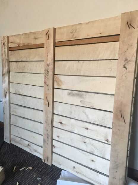 Encontrar una buena, limpia plataforma para formar la parte posterior de la plataforma. Usé una lijadora excentrica con papel de grano 60. Tomé algunos tablones amplia desde otra plataforma para los estantes. Lija para quitar cualquier manchas superficiales. Cuando saqué los tableros para estantes, se rompieron aparte, para que borde pegado detrás juntos antes de lijar.