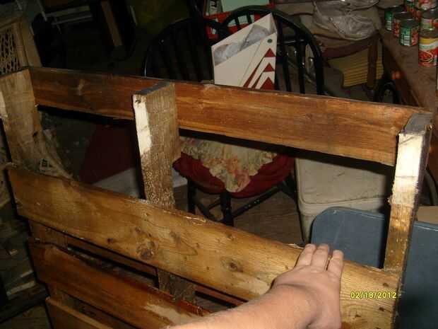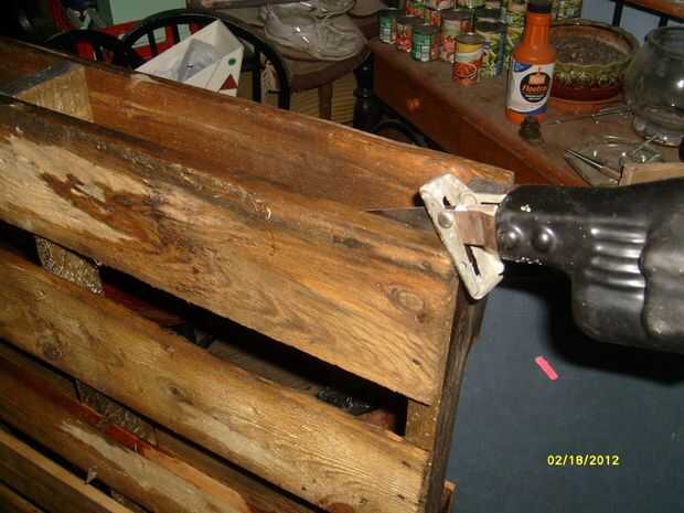 La forma más sencilla que he encontrado separar las paletas es con una sierra de sable, poner en una hoja para cortar y poner bien en la articulación entre la 2 x 4 y los listones. Entonces que solo se aplica una ligera presión hacia adelante para que el pie es contra la Junta entonces el gatillo sólo que la sierra haga el trabajo sólo añadir un poco de presión cortará a través de las finas uñas que utilizan en la plataforma. También he encontrado que es más rápido hacerlo a un lado entero en un tiempo y luego el otro y luego el centro. Entonces literalmente caen. Algo que hice en mi primer que me olvidé de hacer en este caso es recortar los extremos para que sea cuadrada para el resto. Ahora Alinee los tableros en la orientación que usted va ser adjuntarlos juntos.