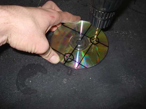 Tomar una pila de tres CDs a la vez y, con cuidado utilizando la plantilla, perfore los orificios. Asegúrese de colocar el taladro en el ajuste más lento y taladro muy lentamente.
