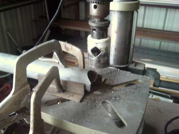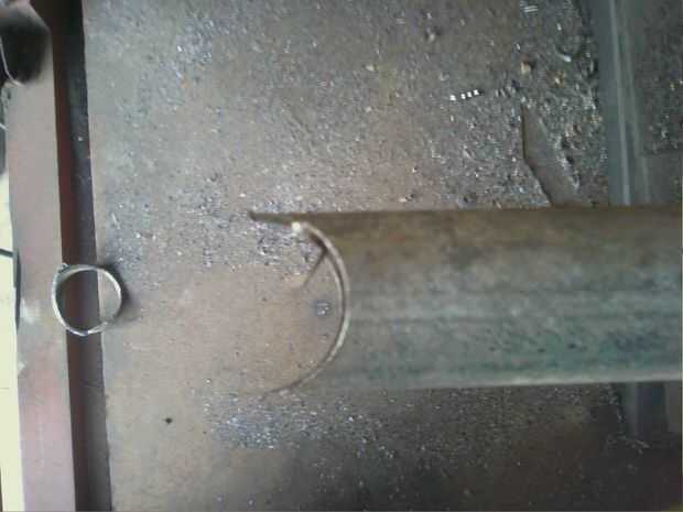 Use un taladro de columna o tubo knotcher para cortar muescas 1-5/8" en ambos extremos del tubo galvanizado de 1-5/8". He hecho (4) de estos en el 11" de largo en el punto más corto. Tengo una estufa de madera que utiliza leña cortar alrededor de 16" de largo. Si utilizas leña más grande, puede hacer éstos más.