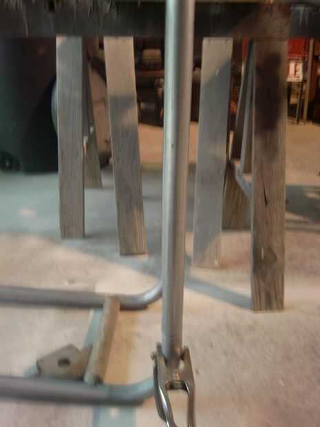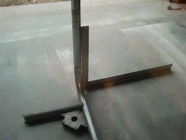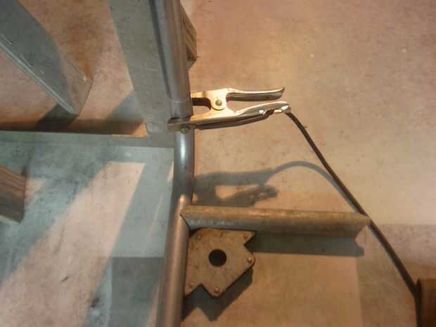 Bases de un pie de la pierna sobre una superficie plana, usando una escuadra de carpintero para hacer que perpendictular al suelo. Sujeta la parte superior de la sección de la pierna recta al caballete para mantenerlo estable tomar uno de los frenillos knotched y ajuste de ángulo recto con la base de la pierna. Soldarlo en el punto donde la base de la pierna es plana en el piso. Pie la otra pierna base de la misma manera y virar al otro extremo de la abrazadera knotched.