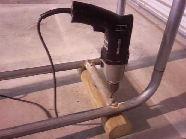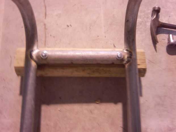 Paisaje madera o tratada de 4 "x 4" aprox. 17" conjunto bajo el fondo knotched llaves y agujeros (2) 3/8" a través de cada uno. Fije un tornillo de retraso de 3/8 "x 3 1/2" a través de cada agujero. Coloqué una tapa sobre cada sección de la pierna recta.