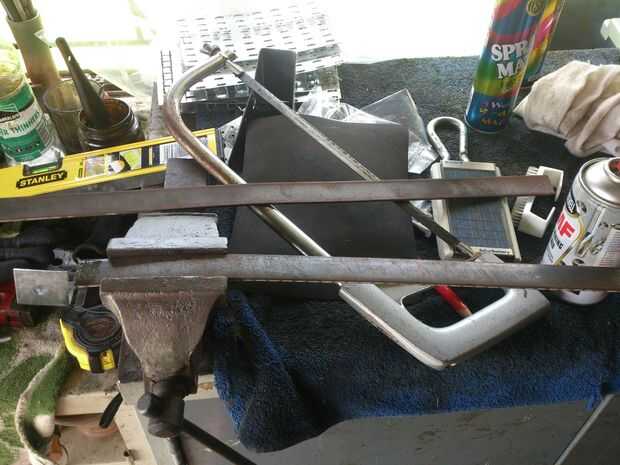 Medida dos longitudes de 55cm del piso de la barra y abrazadera en la mordaza de mesa. Cortar la barra con la sierra para metales utiliza algún líquido de la máquina para que sea más fácil. Cortar seis tiras de 8cm del restante barra plana.