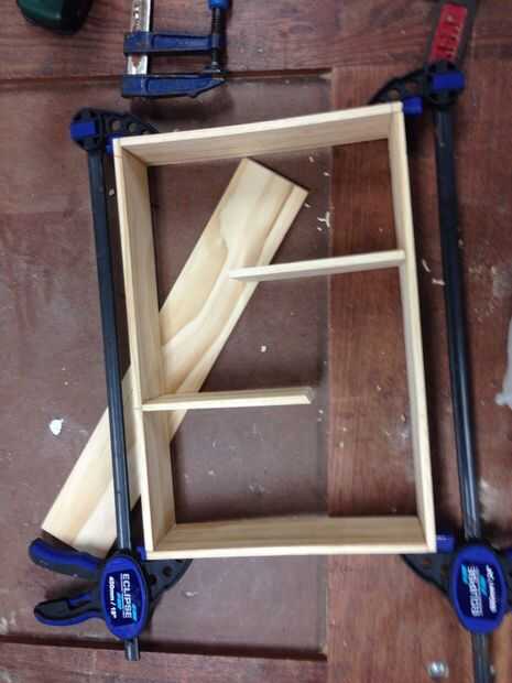 Durante el uso de una plaza de tri, pegamento, clavo y abrazadera de F de los dos juntos. Asegúrese de que la viga transversal se alinee con las repisas cortadas diagonalmente una vez que se corta a la medida, sin embargo no lo ponga mientras que el F está siendo pegado juntos.