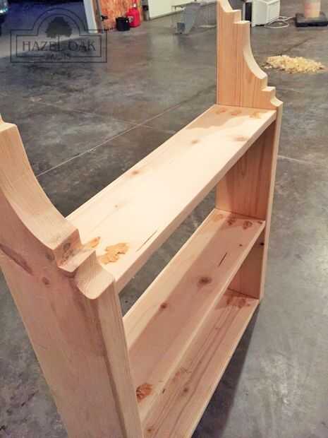 Ayuda a fijar el estante superior primero, que forma el taladro dispone de espacio suficiente para conseguir los otros 2 estantes adjuntados. Utilice tornillos de agujero de bolsillo de 1 1/4 de pulgada, así que los tornillos no pasan por los lados de 2 x 6. Luego simplemente coloque los dos estantes como la foto de arriba.