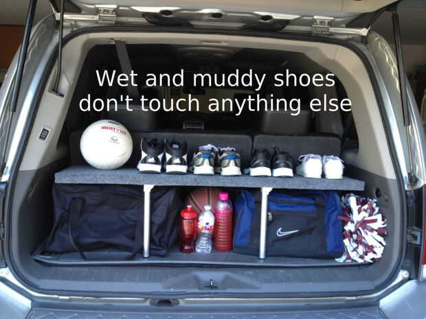 Mi solución es una plataforma emergente. Me ahorra dinero al no tener que reemplazar artículos de abarrotes, esfuerzo al no tener que limpiar el barro de nuestros artículos de los deportes y la frustración me dando fácil acceso a todo sin cavar a través de un montón de cosas para encontrar lo que necesito. También me siento más seguro sobre ocultar bolsas o monederos a la vista cuando tenga que dejarlos en el coche. ¿Quieres construir tu propio? Si deseas este Instructable estás en su camino.