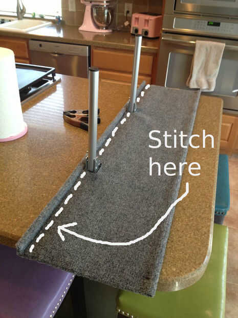 Empezar por doblar la aleta en la parte posterior de la plataforma y una línea a lo largo del borde posterior de la plataforma desde el borde izquierdo al borde derecho de la costura. Usé otra vez las abrazaderas para sujetar la alfombra agradable y plana para hacer la costura fácil y rápido. Una simple puntada corriente hará el trabajo. Utilicé hilo negro que hundido en la alfombra, para que la costura no se presentaron. Esto es una ventaja porque mi costura fue rápida y eficaz pero no necesariamente estéticamente agradable.
