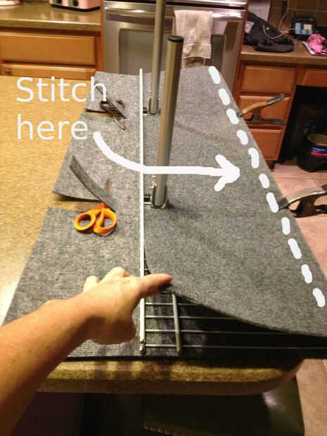 A continuación doble la alfombra sobre la parte delantera de la plataforma, teniendo cuidado de meter las aletas bajo los soportes de la pierna. Coloque la tapa frontal debajo de la aleta del borde trasero del estante. Utilice las pinzas para sostenerlo en lugar. Coser otra puntada de funcionamiento de la plataforma justo en el borde izquierdo del voladizo corto de la parte delantera de la plataforma. Este punto llevará a cabo la alfombra apretada en el voladizo delantero en el estante.