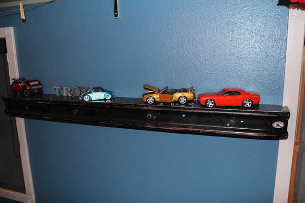 Mi hijo, Troy estaba reorganizando su habitación y me preguntó si podríamos hacer un estante de un viejo camión de parachoques. Tuvimos un pequeño parachoques trasero original con los soportes de montaje de un IH Scout II que encajan casi perfectamente el espacio de la pared. Pensó en conseguir colgó primero y luego hacer un estante de madera al comienzo, pero más tarde decidió al comienzo con la placa de piso de acero para que parezca más a un parachoques de escalón.