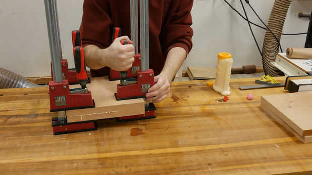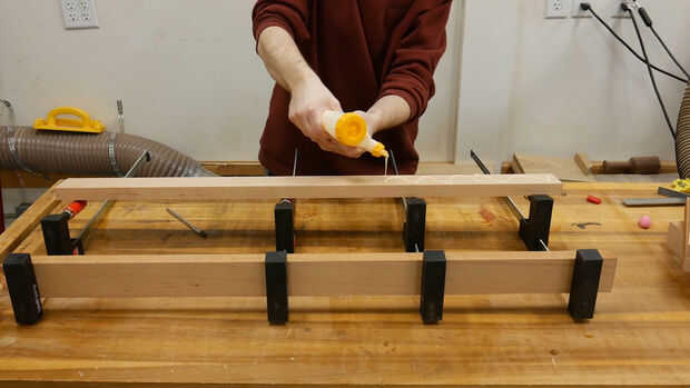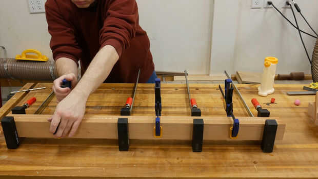 El ensanchador se hace laminando dos tableros de 3/4 pulgada de espesor, 2 pulgadas de ancho y 36 pulgadas de largo cerezo.