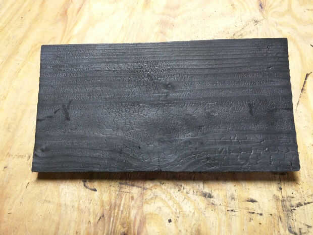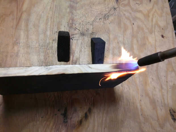 Con mi soplete que me puse del lado de la cara de la madera hasta que fue completamente carbonizado, entonces hizo la espalda, lados y extremos. Luego acercó la cara y la espalda una segunda vez.