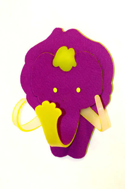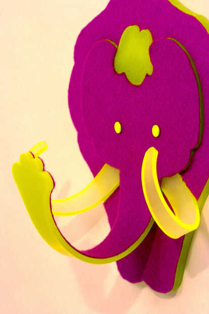 Fue diseñado en Adobe Illustrator y lasercut sus tres capas de acrílico de 1/4". Usé una cama vac-u-ex calor para ablandar la capa superior por lo que pude enrollamiento de su tronco y los colmillos. Usé tazas de café de papel para doblar el acrílico, como lo fueron el justo tamaño y ligeramente cónicas. Luego rocía cada capa con pintura fluorescente, pero mantuvo el papel de la película sobre los colmillos, que fueron doblados por lo que pude golpear apenas los bordes con la pintura. Me adherí entonces las tres capas junto con cemento acrílico, fieltro montado en spray sobre su cuerpo para un divertido efecto lanudo. He pintado dos botones para los ojos y unido con pegamento rápido de sistema. Se bloquea con un pasador de empuje fácil!