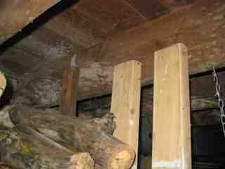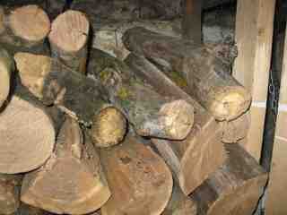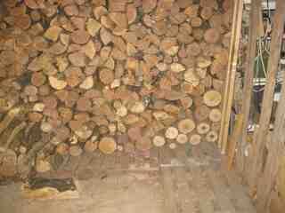 Posición de la plataforma y soporte de 2 x 4 vertical sobre el boquete entre los dos últimos topboards. Baje la parte inferior de la 2 x 4 en Boquete y apoye la tapa contra una viga de piso. Debe haber al menos 2 columnas por fila de madera apilada. Cada extremo de los pedazos de leña debe apoyarse contra los montantes. Como apilar la leña, asegúrese de que los montantes permanecen vertical para que la madera en la parte superior de la pila tendrá dos puntos de contacto.