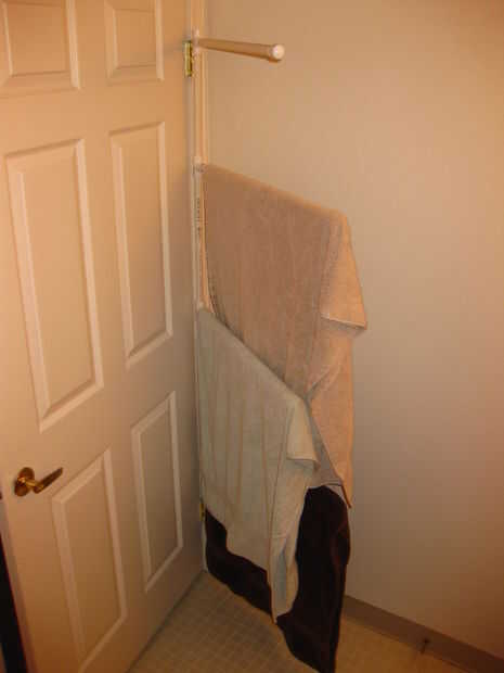Una sugerencia sería usar PVC grueso, tal vez 1 1/2", en las partes verticales, incluso toda la cosa, aunque puede tardar hasta mucho espacio detrás de la puerta. Probablemente esto ayudaría con el problema del estante entero haciendo reverencias cuando se carga con toallas húmedas.