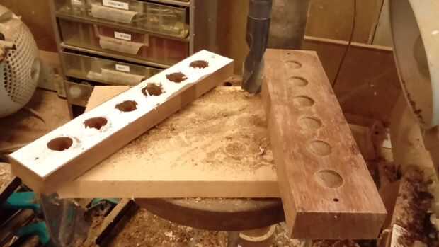 Utilizando una broca apropiada al tamaño de sus tubos de ensayo, perfore las secciones superior. Le aconsejo la perforación a través de casi todo el camino de un lado y los bancos la pieza y terminar del otro lado para reducir rasgan hacia fuera.
