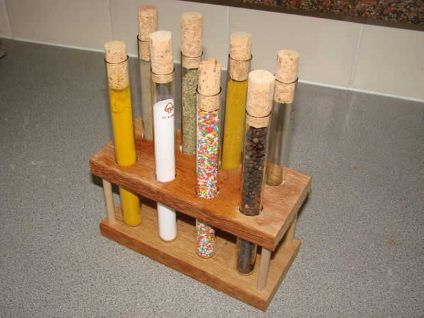 aquí es un estante de especia de tubo de ensayo que hice para todos mis especias. He intentado mejorar anteriores especieros de tubo de ensayo que he visto usando un agradable aspecto de madera contrachapada de bambú y utilizando anillos de gran tam