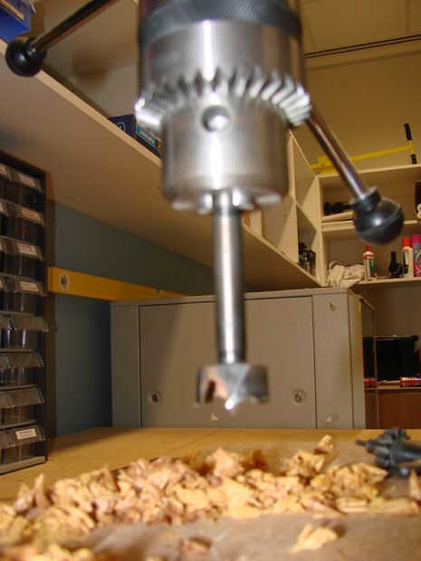 Utilice una broca de pala u otra broca grande como aplicable para perforar completa a través de los agujeros para sujetar los tubos de ensayo en el nivel superior.