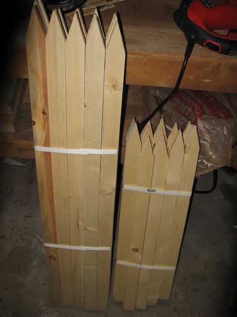 Debajo está una foto de los bloques de edificio básicos para este proyecto. Hay un paquete de 25, 1 x 2 x 36" jardín de estacas y un paquete de 25, 1 x 2 x 24" estacas de jardín. 36" clase se utilizan para hacer piezas largas de los estantes mientras que la clase de 24" se utilizan para todas las piezas pequeñas de los estantes. Lowes tiene realmente mucho en estas cosas... a prestar atención y evitar paquetes con un montón de piezas deformadas, astillados o feos.