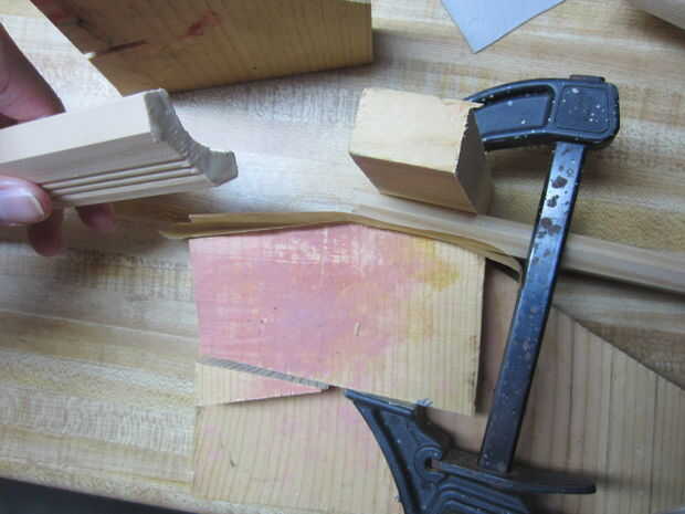 En primer lugar, una sola pieza fue fijada en exactamente el centro de la plantilla. Papel de pergamino fue utilizado para evitar la cola para madera por todas partes. La segunda pieza fue cubierta en pegamento, pulsa arriba contra él y afianzado con abrazadera firmemente manteniendo la presión hacia adentro hacia la primera pieza. Busque algun pegamento exprimir hacia fuera y permanecer donde está cuando lo suelte. Luego limpie y deje que se seque.