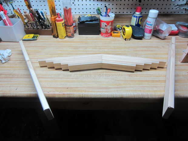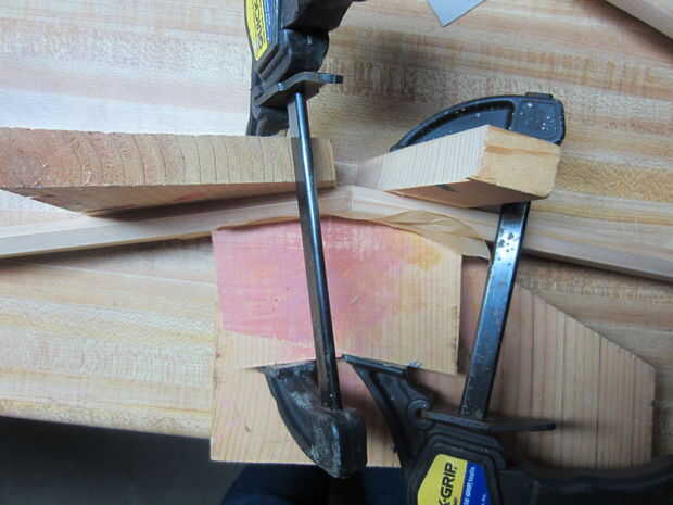 Para comenzar con, pegan cada par de piezas de la plataforma. Para empotrar, corté algunas piezas de madera de desecho en los mismos ángulos de 9 grados en la sierra trozadora. Básicamente quería un punto convexo para sentarse las piezas contra el y una zona cóncava para asegurar las abrazaderas. Puesto que no podía cortar la parte cóncava con el chop vio, acabo de cortar recto y usado una pieza cortada como un espaciador para los bordes paralelo otra vez.