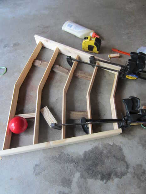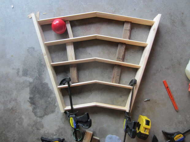 Otro punto a mencionar es que construí para sentarse a ras contra la pared. Para tener espacio suficiente para las bolas más grandes, no fije las filas para el centro de las piezas laterales. Como se puede ver, todas las piezas en estas fotos están tocando el suelo. No sólo era más fácil de pegar, también significó que los estantes del producto final se espacian tan lejos de la pared como sea posible.