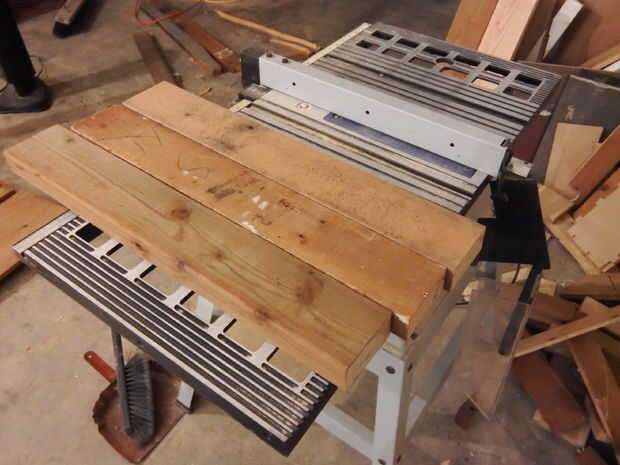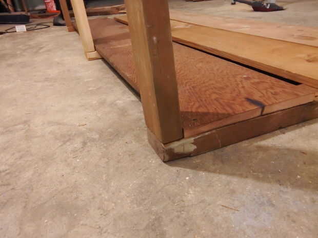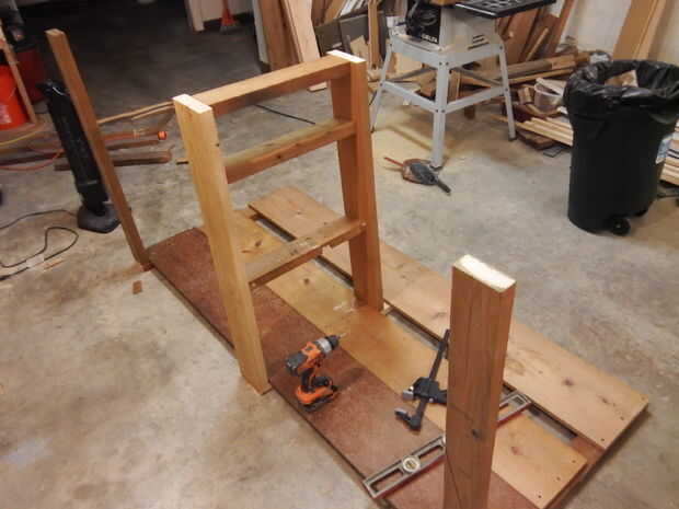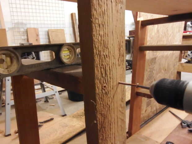Planificación por delante con restos de madera es muy difícil porque es difícil saber qué materiales deben usarse primero. Sin embargo, decidí comenzar desde el centro y usa un 2 X 6 para la viga de centro y 2 X 4 para las vigas laterales con los tornillos de 3" para fijar las vigas en cada empalme y 1.5" tornillos para sujetar los tableros de piso con un espacio para el grado 5 en ángulo 2 X 6 en la parte posterior. Utilicé una sierra de mesa para cortar los ángulos de grado 5 por los extremos acoplar correctamente. Durante la perforación, utilice un nivelador para asegurarse de que las vigas están en ángulo recto y recto. Usé una escuadra para asegurarse de que las vigas verticales son perpendiculares. No te preocupes si la estructura es un poco inestable en este momento ya que se reforzará posteriormente. Si desea agregar estructuras de apoyo temporal puede.