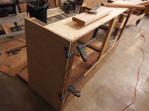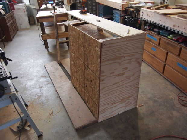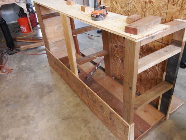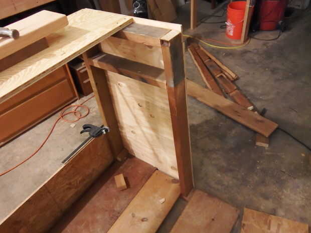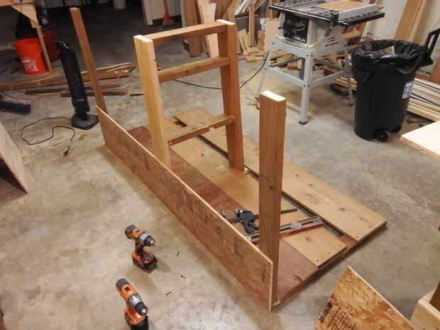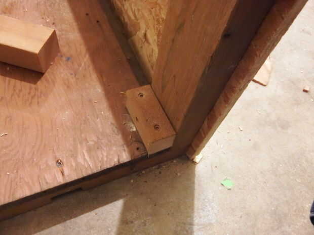 A continuación, añadí algunos refuerzos en las esquinas inferiores de las vigas del frente. Luego cubrí el lado izquierdo con madera contrachapada. Es más fácil simplemente poner la madera contra el marco y use un lápiz para delinear los cortes necesitados. Para un diseño más limpio, puede superponerse la madera contrachapada para ocultar los ángulos de 2 X 4.