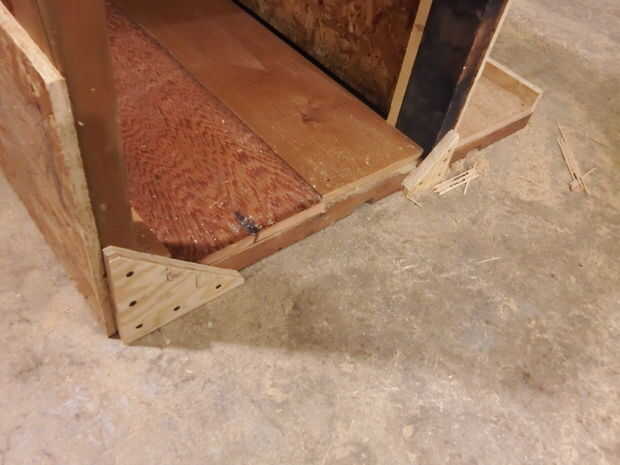 Finalmente, había acabada la estructura por el cierre de la parte superior y con hojas de desecho de madera contrachapada y entonces agregan refuerzos de triángulo de madera contrachapada para reforzar el extremo abierto de la rejilla de madera. También tuve una tira fina de madera contrachapada que era capaz de añadir en el borde inferior de la sección de productos de hoja para guiar las hojas al resbalar en.