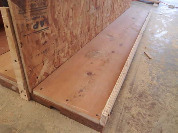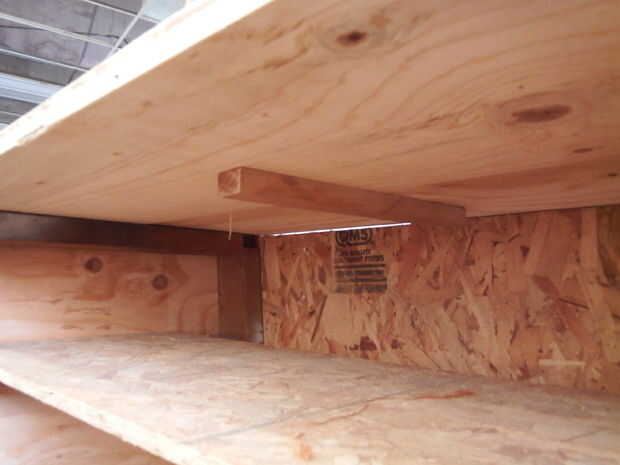 Pequeños pedazos de madera se atornillan debajo de la superficie de la mesa donde la costura de la madera contrachapada se separa para convertirla en una pieza sólida. El extremo abierto de esta bandeja de madera era la parte más débil de la estructura así que asegúrese de probar su resistencia que se inclina y empujando contra él. En caso de duda, añadir tornillos alrededor de la estructura.