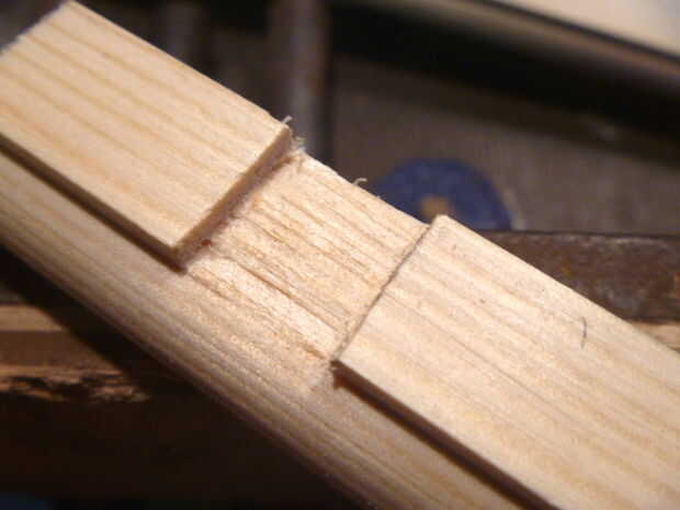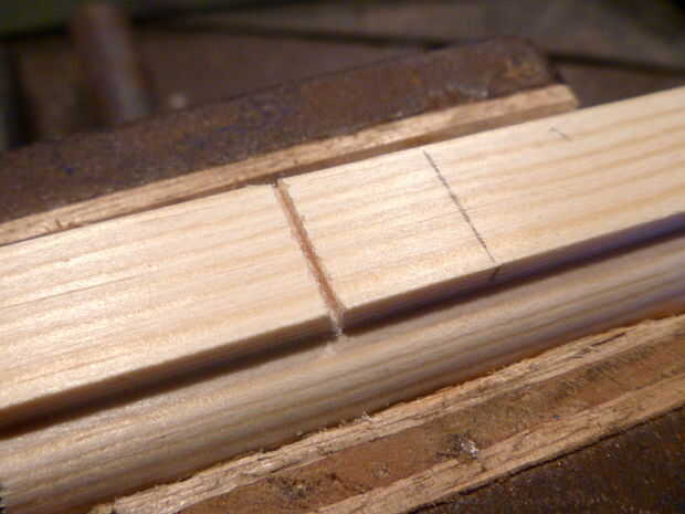 Decidí hundir mi 'carril de atrás' en los rieles laterales. Para ello cortar dos ranuras de la anchura del 'riel posterior' aparte y cincelado el medio fuera sólo golpeando suavemente una mortaja cincel con un martillo de madera.