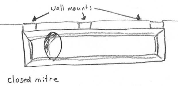 Mi plan original era tener un cerrado mitre como en (1) pero atornillado directamente a la pared. Más tarde decidí no hacerlo como algunos huevos más largos no caben en el estante como que le toque la pared. Si usted tiene abalorios más grueso o hecho girar el Abalorio que utiliza en su lado, podría tener espacio suficiente para que los huevos largos.