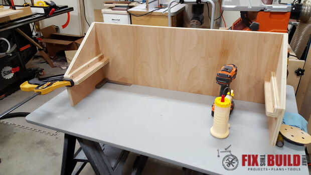 Corte un soporte del lado izquierdo a 1-1/2" y un taco de 1". Se unen a los dos juntos para formar un soporte en L y fije a la pieza del lado izquierdo, 5" hacia abajo desde la parte superior.