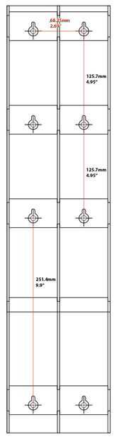 Escoge una mancha en la pared para montar el bastidor. Si usted tiene acceso a una impresora de gran formato, puede imprimir la plantilla de montaje para los agujeros de tornillo. Otra manera de medir. Los agujeros son ~ 68mm (2,6875") ancho aparte sabia y los 3 primeros conjuntos son tapa aparte ~ 126mm (4,95") al fondo. El cuarto conjunto de orificios de montaje en el soporte inferior está ~ 251mm (9,9") por debajo el tercer juego.
