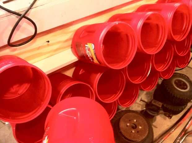 Después de haber montado la madera a una pared (o una mesa de trabajo, en mi caso), colgar los envases en sus tornillos y empezar a llenar con cosas.