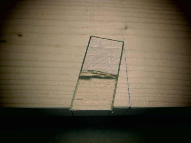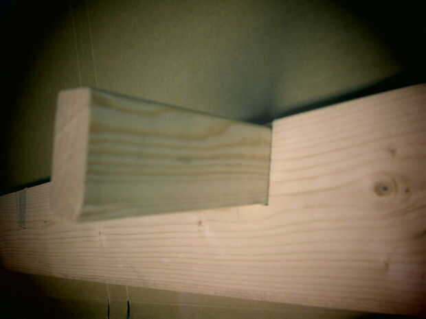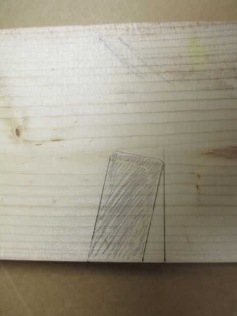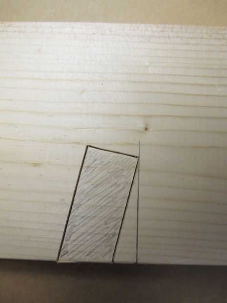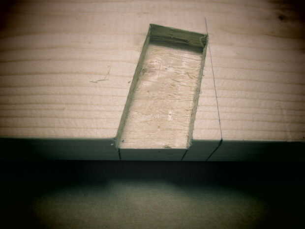 Ahora el proyecto obtiene un poco más complejo. Yo he maldecido con lo que yo llamo abuelo estándares. Si vas a tomar el tiempo para construir algo, construir para durar. Esto significaba que yo podía no atornillar todo juntos. Puse a los estantes de 1 "x 2" ángulo en mi 1 "x 4". Trazado el contorno, tomó un cuchillo y anotó el contorno y un cincel de madera y un martillo a la muesca de un canal de 3/8" de profundidad. Pruebo con un pedazo de chatarra.