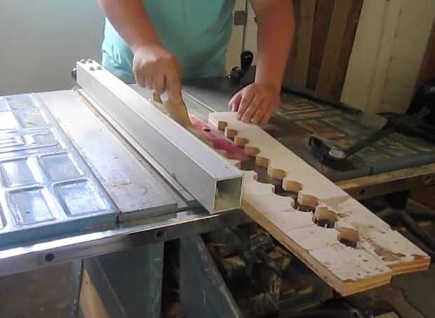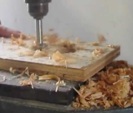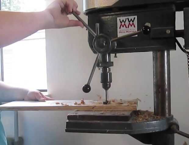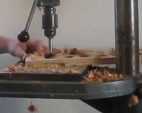 A continuación, perforé una serie de orificios a través de la parte superior de la rejilla (que en el momento se encontraba todavía en una sola pieza) con un 1 1/2" forstner broca con el centro de los agujeros espaciados por 2". Procedió a extraer la pieza por la mitad en la Sierra de mesa que me den la parte superior de cada una de las parrillas con semicírculos para las herramientas en. Entonces, tomó las bases de ambos de las rejillas y establecer la profundidad de corte en mi taladro a aproximadamente 1/4". Si no tienes un taladro con un tope de profundidad, se puede usar un taladro con pintores azul cinta envuelta alrededor de la broca y deje de una vez el borde de la cinta. Espaciados estos apart para que coincida con los orificios en la parte superior.
