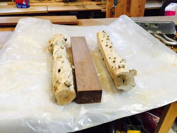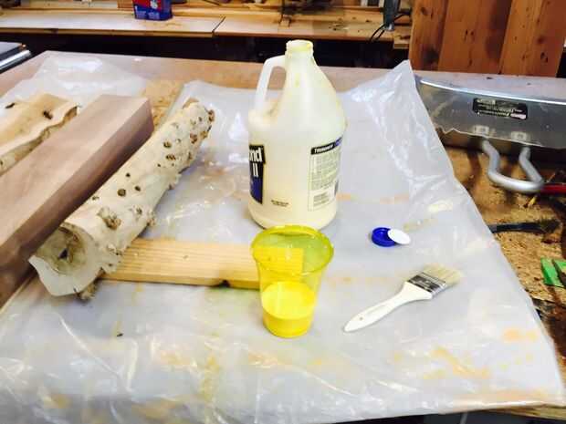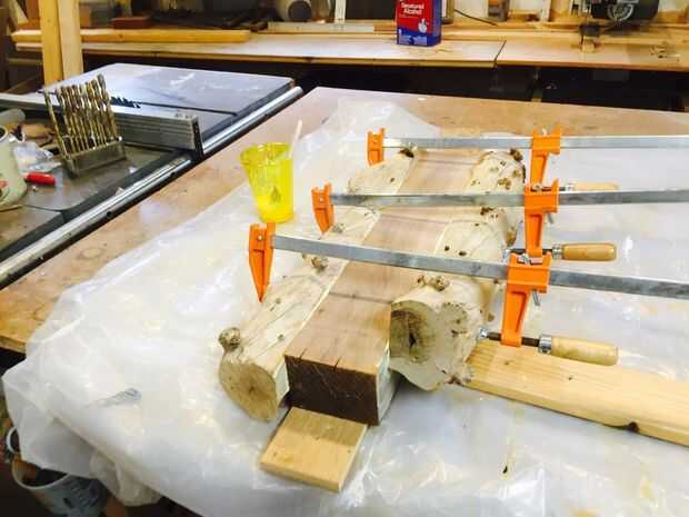 Pegar las piezas de madera a la media 3 "x 4" pieza, utilicé un pincel de chip para extender el pegamento. Sujete con abrazaderas de la barra y se deja fijar un día para otro. Esta madera es ultra duro así que pude sujetar directamente a ella sin estropear. Para madera suave use pequeños pedazos de madera sacrificio entre la abrazadera y la pieza o con abrazaderas de plástico.