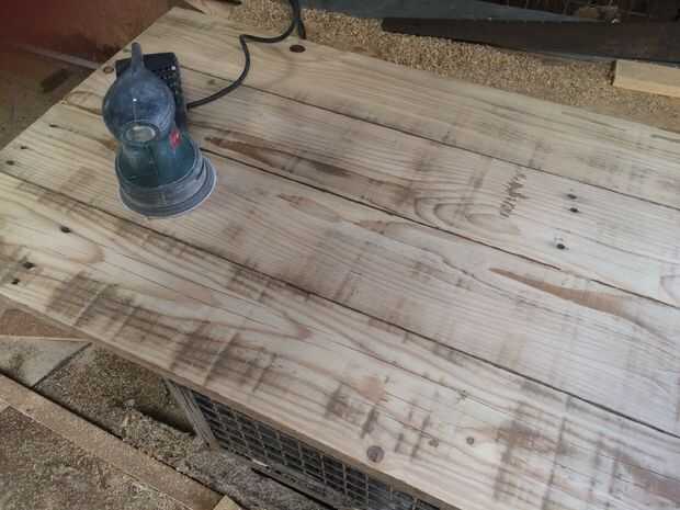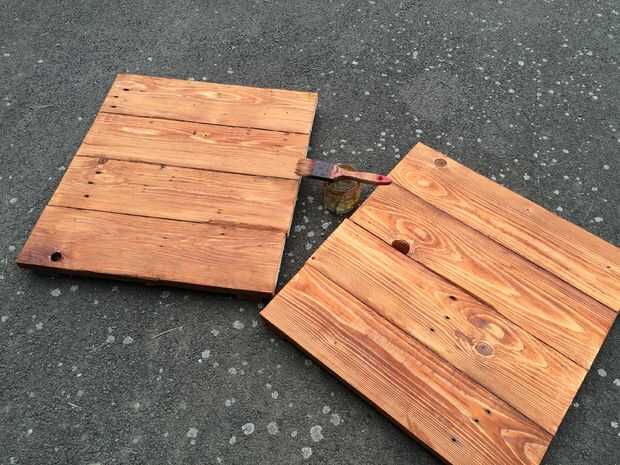Lijar las partes antes de montar porque me gusta el look arenado y eliminar la mayor parte de los fragmentos de madera. Lo barnizado más tarde porque pensé que de lo contrario no es resistente a la intemperie.