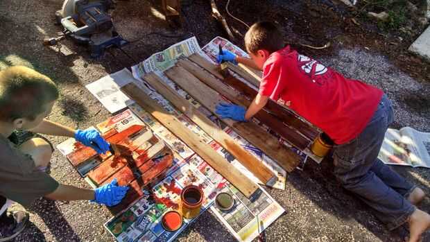 usé una sawsall para cortar las uñas y cortar el palet. Que mina corte en el primer cono, esto me dio mucho si espacio para trabajar con. Mancharon entonces (con la ayuda de los niños) las tablas. Usé "stock de armas" para los montantes y el "golden oak" para las tablas.