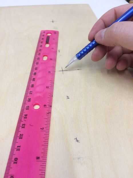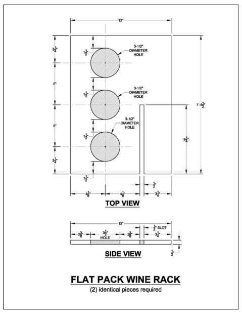 Primero deberás colocar la madera y marcar los cortes. Los cortes se distribuirán según el croquis adjunto - habrá una ranura en cada medio donde se intersectan las dos piezas, y tres agujeros para las botellas en cada parte. Os he adjunto un archivo pdf para rack con 3 agujeros para que usted puede imprimir una página de referencia.