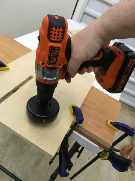 Después de haber asegurado su línea de madera, la broca piloto de la broca del agujero para arriba con el centro de los agujeros y empiece a cortar. Tenía un tiempo duro con el taladro inalámbrico con energía suficiente para cortar a través de la 1/2" madera contrachapada, así para cada agujero que cortar a la mitad y volcó luego cada pieza para terminar el agujero del otro lado. Usted será capaz de utilizar el agujero piloto centro de la broca y terminar el corte. Esto puede ser un dolor porque tienes que mantener aflojar y sujetar, pero esto también ayuda a evitar el arranque, que será un dolor para cubrir para arriba más adelante.