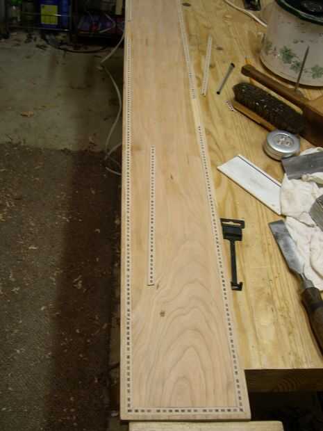 El pegamento y había curado completamente durante la noche, utiliza un plano suavizado para derribar la incrustación metálicas al ras con el tablero y siguió con un raspador con una tarjeta.
