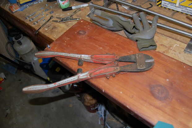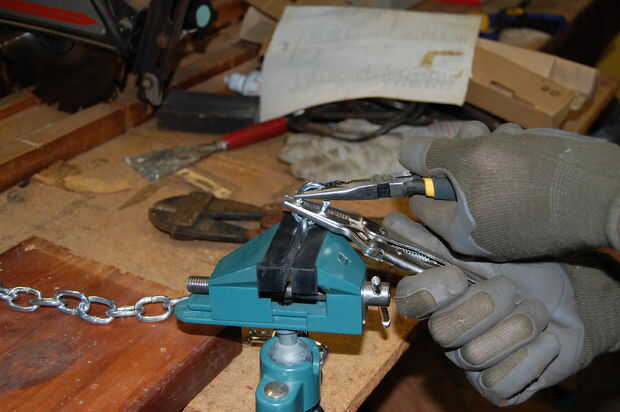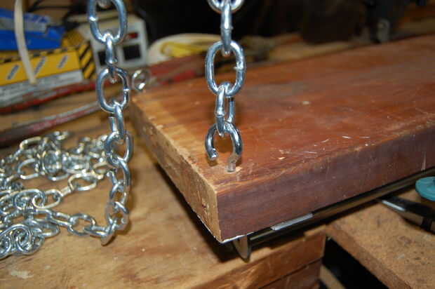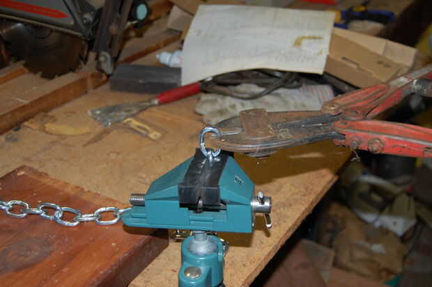 Después de rastrear mis cortadores de perno, cortada la longitud de cadena de 10' en 4 secciones de 2.5'. Los dejé largo para que pudiera estar seguro de que tenía cierto margen de maniobra en el montaje final. También usé un tornillo de doblarlas abierto para facilitar el colgante con la cadena.