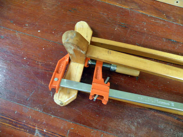 Terminar tomando una de las piezas de la "pata" de la muleta (la pieza inferior largo con todos los agujeros en ella) y poner entre los cuatro trozos de madera doblados. Reutilizar algunos de los pernos para fijar como se muestra; los orificios existentes pueden ser utilizados para los tornillos en una dirección, pero el otro eje requerirá nuevos para taladrar por encima o por debajo de los otros.