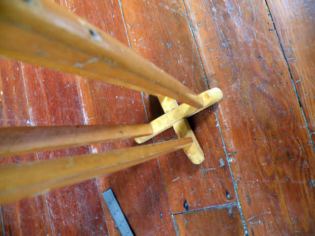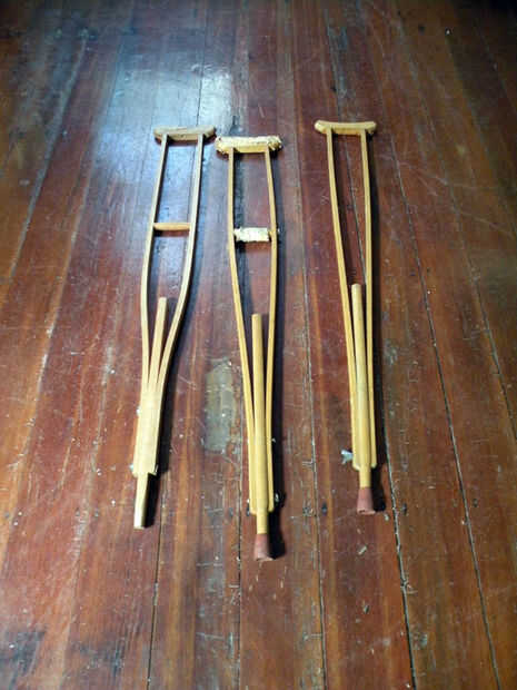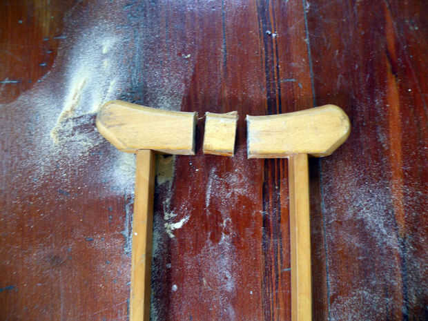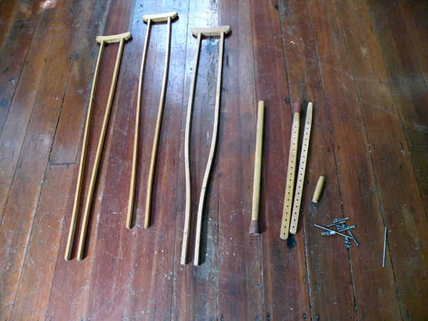 Desmontar completamente las muletas. Dejar de lado los tornillos y accesorios. Tira cualquier espuma o relleno de los soportes de la axila. Deseche las manijas. Si usted está planeando para repintado completamente la madera, la arena ahora con papel de lija de grano 100. Es más fácil de hacer ahora, porque después de la Asamblea, habrá mucho torpes rincones y grietas que son difíciles de conseguir lija bien.